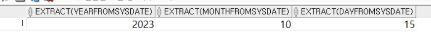 SELECT EXTRACT(YEAR FROM SYSDATE), EXTRACT(MONTH FROM SYSDATE), EXTRACT(DAY FROM SYSDATE)