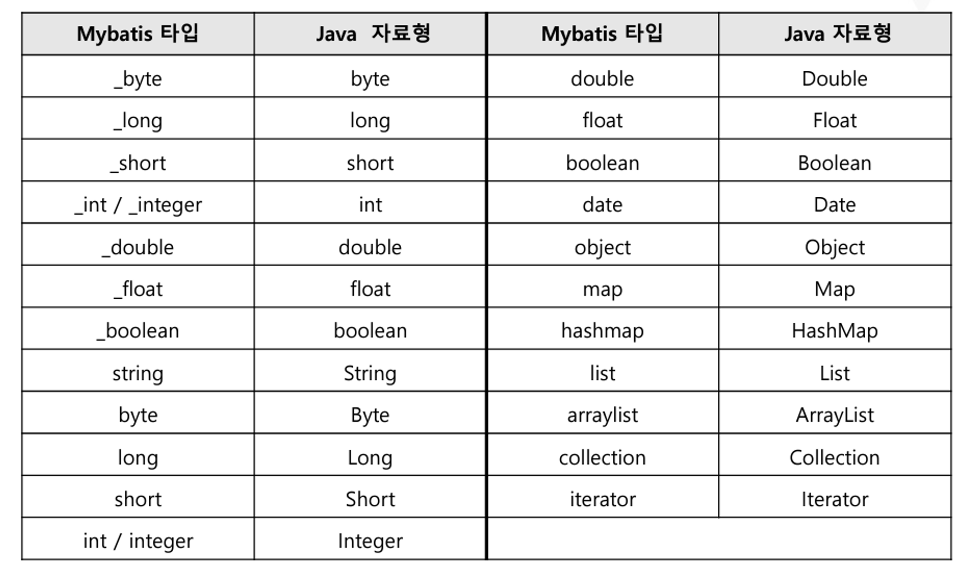 ➡️ 쉽게 생각하면 Java에서 사용하는 기본자료형에는 Mybatis자료형은 prefix로 _(언더바)가 붙고, Object or Collection 자료형은 Java에서 첫글자를 대문자로 표기하지만 Mybatis에서는 첫글자를 소문자로 표기하면된다.