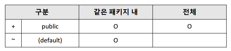 클래스는 2개의 접근제한자로 선언할 수 있지만 필드는 4개의 접근제한자로 선언할 수 있다.